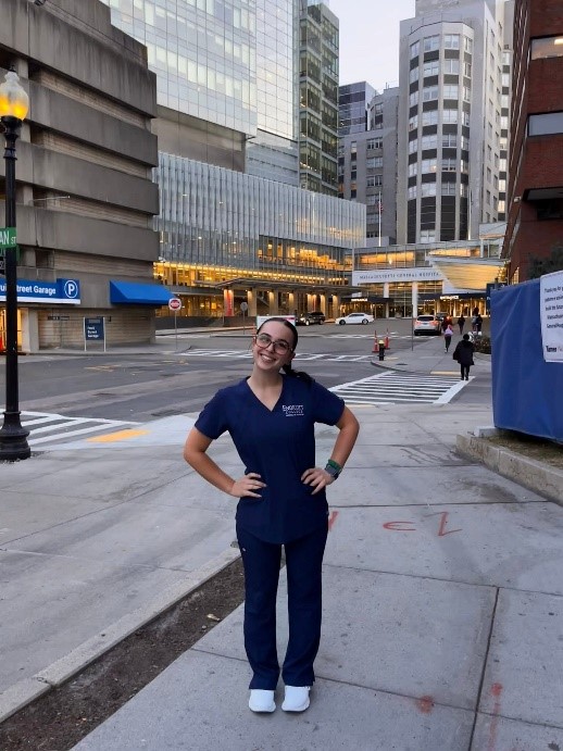 Olivia Reguin, student nurse, standing in front of Massachusetts General Hospital