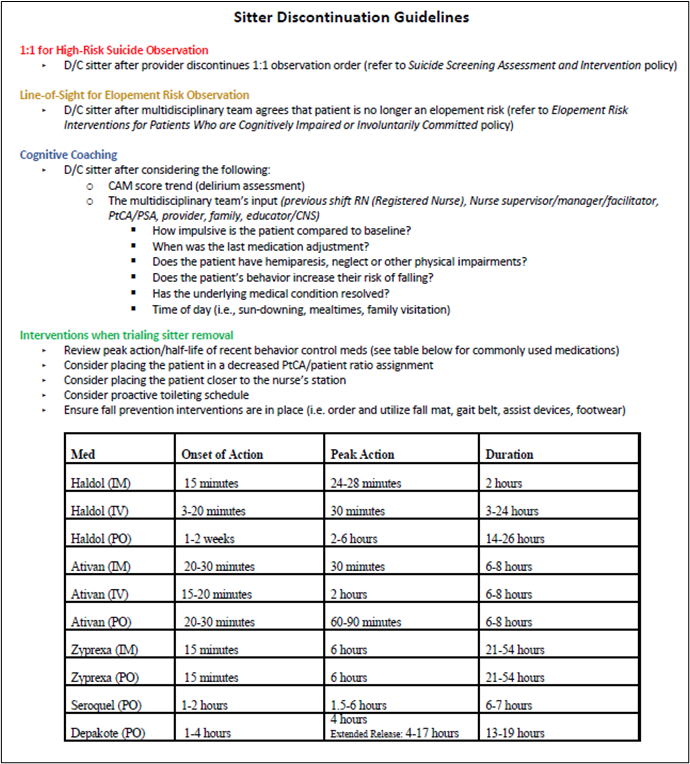 At the conclusion of the one-month trial, an electronic survey was distributed to staff. The results showed that 100% of staff now consider medication changes prior to removing a sitter. All of the individuals who used the guidelines during the trial reported that it improved their comfort in decision-making when removing a sitter. Staff shared, “I liked the guidelines; they were helpful!” and “I really liked the list of medications on the guidelines; that was a great reference.”