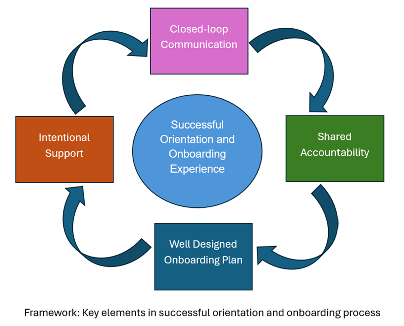This framework connects crucial aspects for successful orientation and onboarding of new hires, promoting experiential learning. This structural framework is non-linear; each component exhibits dynamism and can interact throughout the orientation and onboarding process. Effective orientation and onboarding depend on all key areas; missing one can led to employee failure and disengagement, disrupting the learning process.